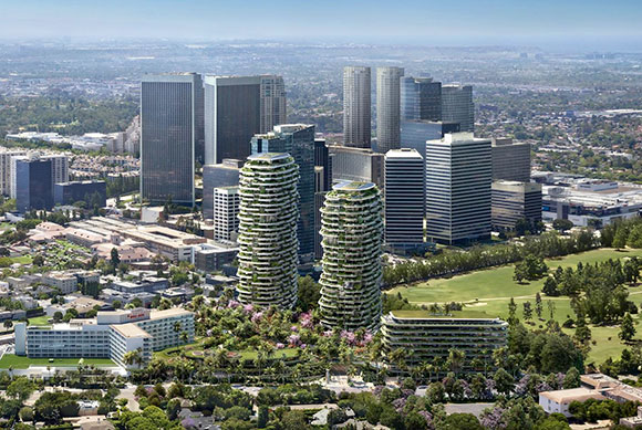 At a whopping $2 billion, this one is the biggie. Designed by British architect, Norman Foster, One Beverly Hills will occupy 18 acres with multiple buildings including 255 condos, 79 hotel rooms, 30,000 square feet of commercial area, private club, fitness center with indoor pool, basketball courts, botanical gardens, and parking for 1,900 vehicles. When finished in 2028, the two 30-level residential skyscrapers will be the tallest structures in Beverly Hills. Landscape architect, Rios, will green the project top to bottom with an “eclectic collection of over 200 plant species, including palms, oaks, sycamores, succulents, and olive trees, based on nine diverse and distinct Southern California landscapes.”
