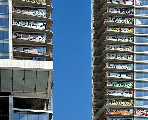 When CallisonRTKL designed this $1 billion residential project of three skyscrapers—each 40 to 50 floors tall—adjacent to Crypto.com Arena, no one predicted what was to come. After construction went on hold in 2019 due to financial challenges with the developer from China, the nearly completed project fell into a state of limbo. Earlier this year under the cover of night, the towers were tagged in an epic show of graffiti, on a scale never seen before. Grabbing national headlines, the public debated whether such action was criminal or artistic. Was Oceanwide Plaza merely the target of vandalism to be condemned or, as LA Times columnist, Gustavo Arellano, claimed: “L.A. at its finest…transform[ed] something ugly into something far more vibrant.”