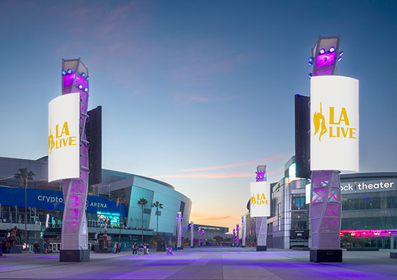 Infilled with an expanded metal mesh exterior, the box-truss towers spiral upward—a challenging feat of engineering and fabrication accomplished by project partners, LA Propoint and JAMA. The three tallest towers frame the most active area of L.A. LIVE, a zone that greets the tens of thousands of attendees for a concert by world-renowed artists or perhaps a Lakers/Kings game.