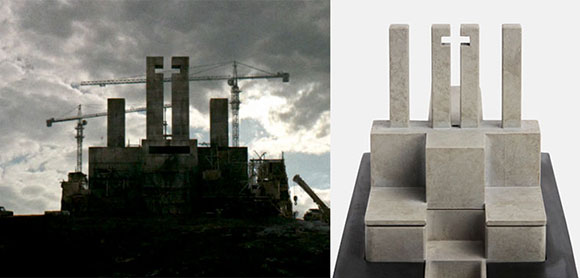 right: Under construction, The Margaret Lee Van Buren Center for Creation and Activity, film still from The Brutalist, 2024; left: This image is not from the movie, but is “The Brutalist Scale Model,” $75 for the limited edition from the A24 shop.