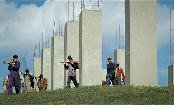 We see familiar references to the work of Louis Kahn, Mies van der Rohe, and Paul Rudolph, but the resulting architecture, particularly the “visionary” community center—Toth’s career breakthrough project—is mildly interesting at its best, clunky at its worst. For that scene of the big presentation, I doubt any architect would walk into a public hearing with such a clumsy-scaled, crudely-made, white cardboard model.